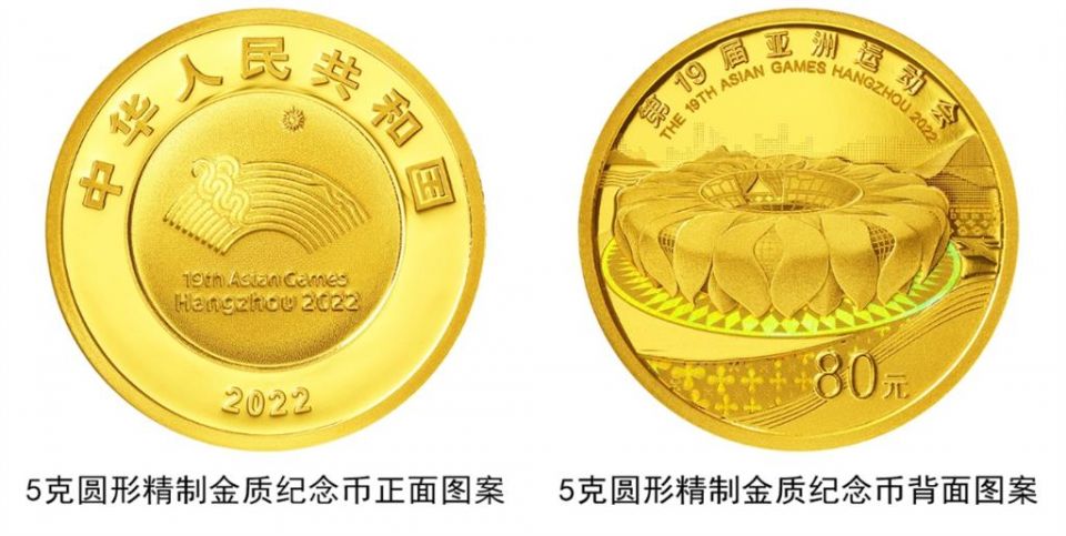 该套金银纪念币正面图案均为第19届亚洲运动会会徽,并刊国名、年号。5克圆形金质纪念币背面图案为杭州奥林匹克体育中心体育场,辅以城市建筑、山水、桂花等元素装饰组合设计,并刊“第19届亚洲运动会”等字样。该纪念币含纯金5克,最大发行量1万枚。