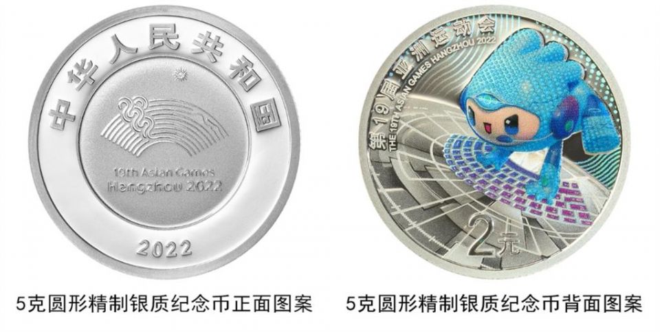 5克圆形银质纪念币背面图案为第19届亚洲运动会吉祥物电子竞技运动造型,辅以互联网科技符号、跑道等元素装饰组合设计,并刊“第19届亚洲运动会”等字样。该纪念币含纯银5克,最大发行量10万枚。