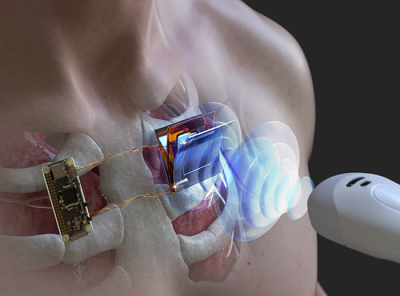 使用超声波探头为人体植入电子设备无线充电的示意图。图片来源:韩国科学技术研究院