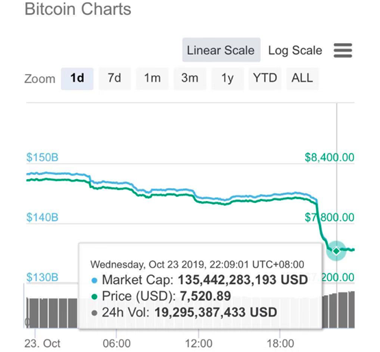 比特币价格在2019年4月起曾一路走高,在7月攀升至12000美元上方,在8月末回调至1万美金以下后回温,9月下旬曾遇冷跌破8000美元关口,此后一度在8000美元上方浮动。其他虚拟货币如以太坊价格也大跌近10%。