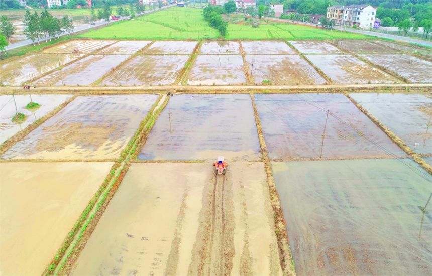 4月18日,丰城市洛市镇熊家村村民驾驶耕整机平整田地。王堃摄