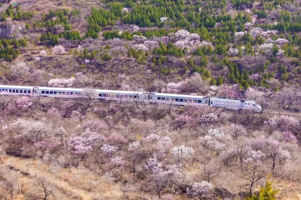 北京市郊铁路S2线沿途开满了桃花和杏花。(中国铁路北京局供图)