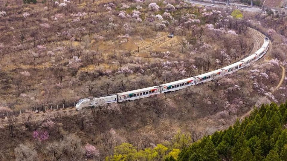 在北京郊外的居庸关长城脚下,蜿蜒的铁路线上,有一趟“网红”列车缓缓穿过漫山遍野的花海,被形象地称为“开往春天的列车”,这便是北京市郊铁路S2线。