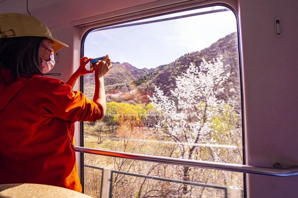 慕名而来的旅客坐上这趟“网红”列车欣赏美丽的花海一睹长城的雄伟。(中国铁路北京局供图)