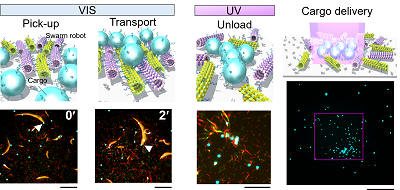 实验中使用的货物由直径从微米到几十微米的聚苯乙烯珠子组成。这些珠子用偶氮苯连接的DNA处理;因此,当货物暴露在可见光下时会被装载,而当暴露在紫外光下时则被卸载。然而,分子机器人和货物中使用的DNA和偶氮苯不同,因此可以独立于货物的装载来控制集群。