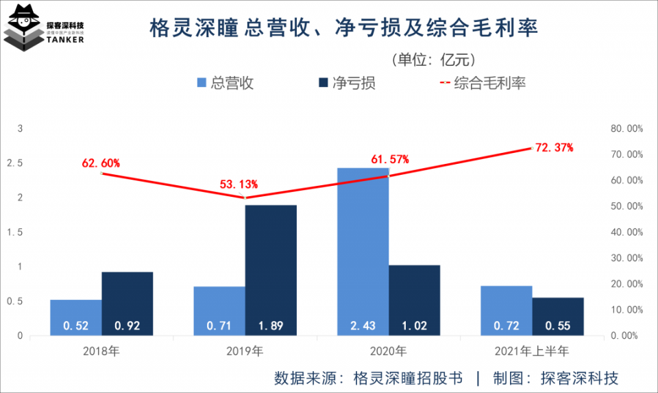 招股书显示,2018-2020年以及2021年上半年,格灵深瞳的总营收分别为5196万元、7121万元、2.43亿元和7219万元;净亏损分别为9230万元、1.89亿元、1.02亿元和5474万元,同一时期,其综合毛利率分别为62.60%、53.13%、61.57%和72.37%。