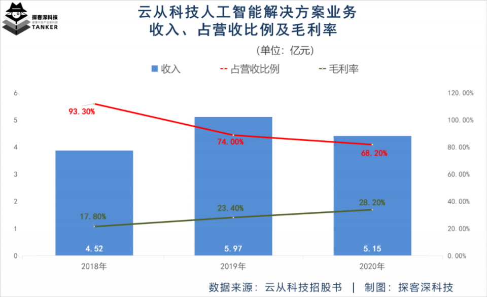 人工智能解决方案业务肩扛营收大旗,但由于毛利率处于较低水平,成为云从科技陷入亏损泥沼的另一原因。
