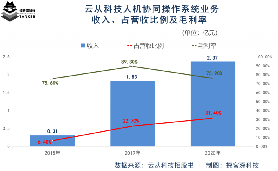招股书显示,2018-2020年,人机协同操作系统业务收入分别为0.31亿元、1.83亿元和2.37亿元,占总营收的比例分别为6.4%、22.7%和31.4%,其收入和收入占比均不断提升。同一时期,该项业务的毛利率分别为75.6%、89.3%和75.9%,远远高出人工智能解决方案业务的毛利率。