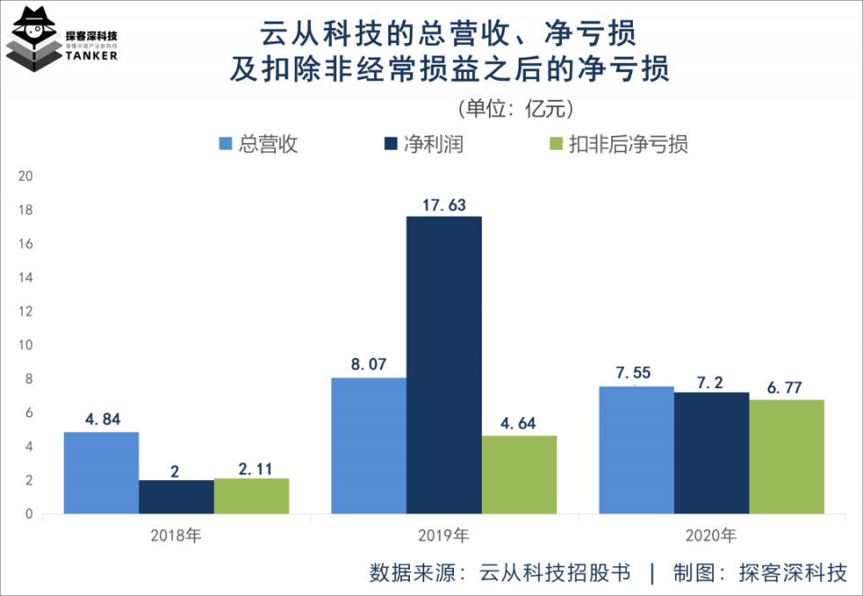 根据招股书,2018-2020年,云从科技的总营收分别为4.84亿元、8.07亿元和7.55亿元,同一时期的净亏损分别为2.00亿元、17.63亿元和7.2亿元,扣除非经常损益之后的净亏损分别为2.11亿元、4.64亿元和6.77亿元。