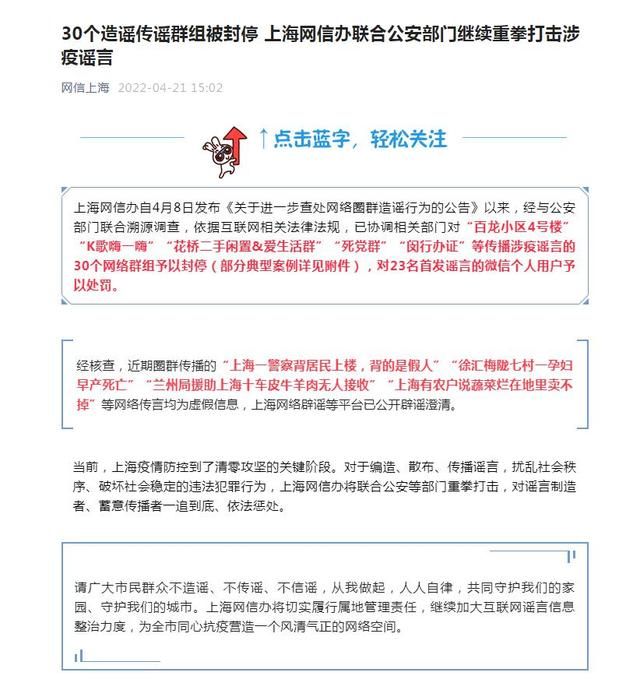 中新网4月21日电 据上海网信办微信公众号消息,上海网信办自4月8日发布《关于进一步查处网络圈群造谣行为的公告》以来,经与公安部门联合溯源调查,依据互联网相关法律法规,已协调相关部门对“百龙小区4号楼”“K歌嗨一嗨”“花桥二手闲置&爱生活群”“死党群”“闵行办证”等传播涉疫谣言的30个网络群组予以封停(部分典型案例详见附件),对23名首发谣言的微信个人用户予以处罚。