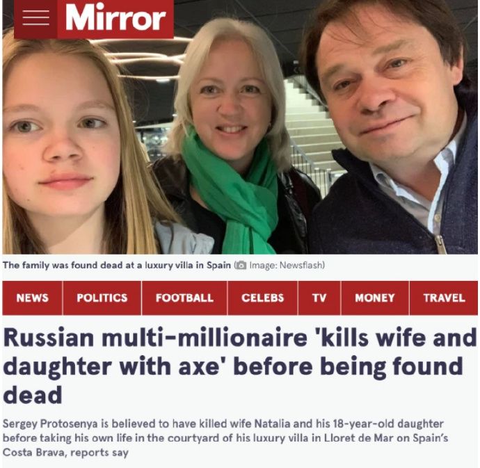 《新闻周刊》援引西班牙新闻网站El Punt Avui的报道说,当地时间4月19日星期二,谢尔盖·普罗托森亚和妻子及女儿的尸体在位于加泰罗尼亚Lloret de Mar海滨度假区的家中被发现。 报道称,这对夫妇育有两个孩子,长子住在法国,当时他无法联系到父母,于是向加泰罗尼亚警方报了警。据报道,普罗托森亚现年55岁,妻子53岁,他们的女儿刚满18岁。普罗托森亚的妻女是被刺死的,而他则是上吊自杀的。