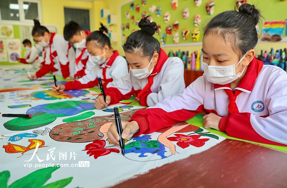2022年4月21日,河北省秦皇岛市海港区文化里小学开展“彩绘长卷倡环保”迎“世界地球日”活动。该校组织教师带领学生在长卷上画出心目中的美好家 园,并通过学习保护地球的知识、开展主题班会、绘制创意画作等方式,引导学生从小树立保护环境、爱护地球的意识。曹建雄摄(人民图片网)