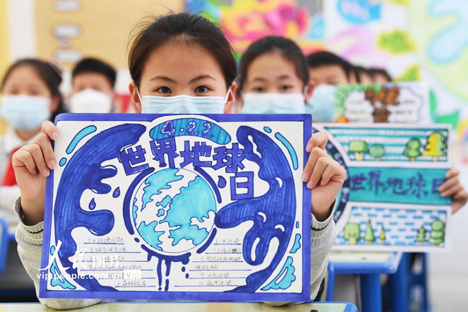 2022年4月21日,安徽省亳州市谯城区风华桐乡路小学开展“珍爱地球 人与自然和谐共生”世界地球日主题教育活动,让孩子们从小树立环保理念和节约意识,关爱地球、爱护环境,迎接第53个“世界地球日”的到来。 张延林摄(人民图片网)