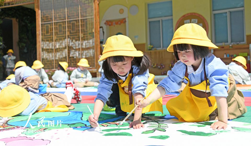 2022年4月21日,浙江省台州市仙居县迎晖幼儿园开展以“珍爱地球 人与自然和谐共生”为主题的教育活动,通过绘长卷、环保时装秀、垃圾分类等教育活动,引导孩子们爱护环境,爱护花草树木,共同守护地球母亲。王华斌摄(人民图片网)