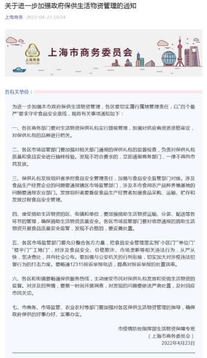 《通知》称,为进一步加强本市政府保供生活物资管理,各区要切实履行属地管理责任,以“四个最严”要求守牢食品安全底线,有关事项如下: