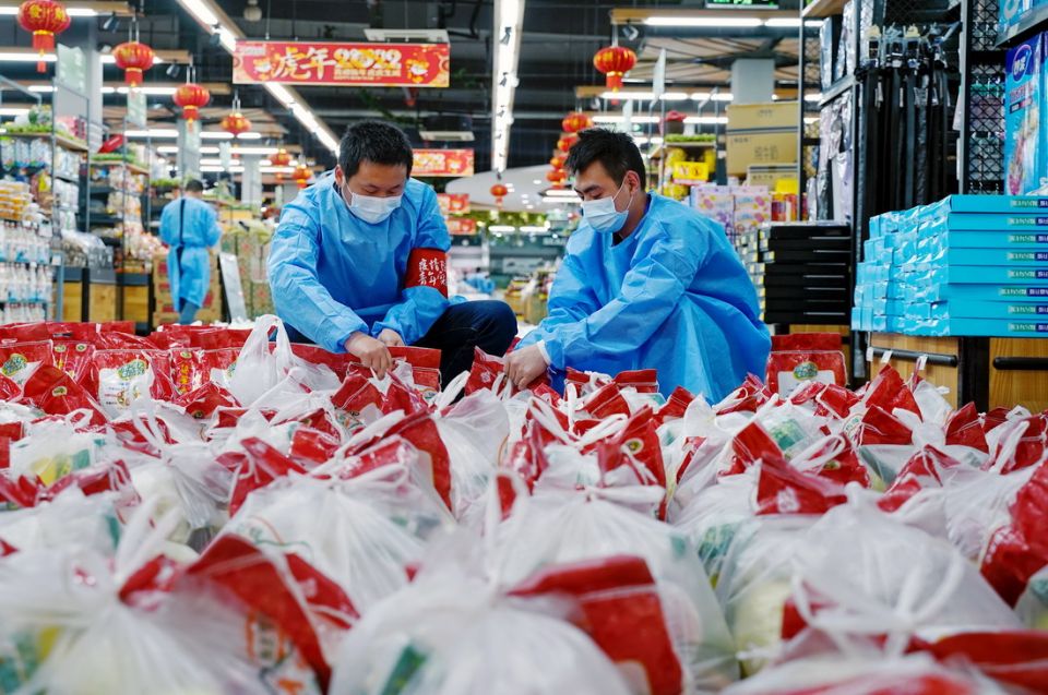 上海市奉贤区西渡街道社区发展综合服务中心的工作人员入驻超市,承担分拣配货等工作(4月17日摄)。新华社发(于薇摄)