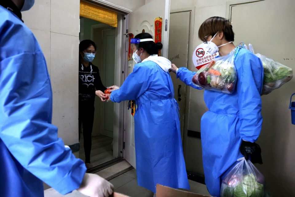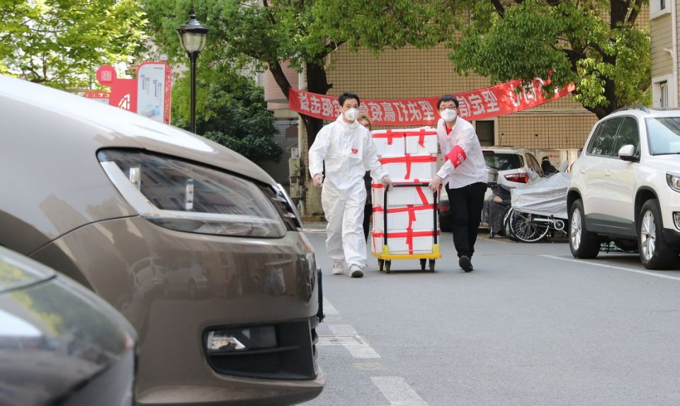 在上海市普陀区锦绿新城,社区志愿者为居民挨家挨户运送生活物资(4月11日摄)。新华社记者 陈飞 摄