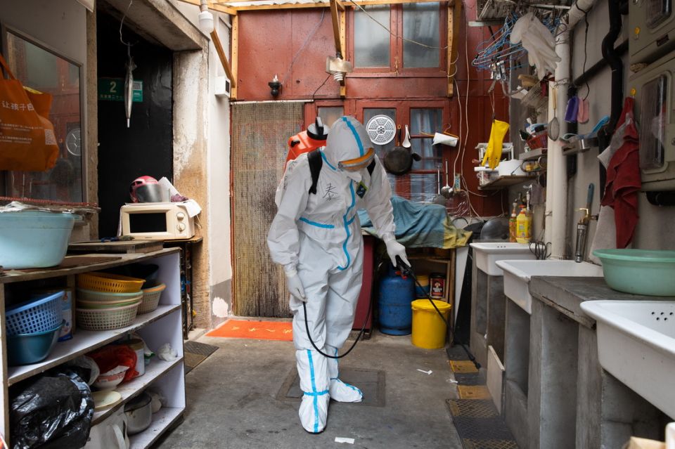 工作人员在黄浦区豫园街道广福居民区消杀通道(4月19日摄)。新华社记者 金立旺 摄