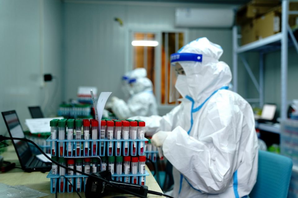 检测人员在核子华曦核酸检测方舱实验室的样本扫码间忙碌(4月15日摄)。新华社记者 张建松 摄