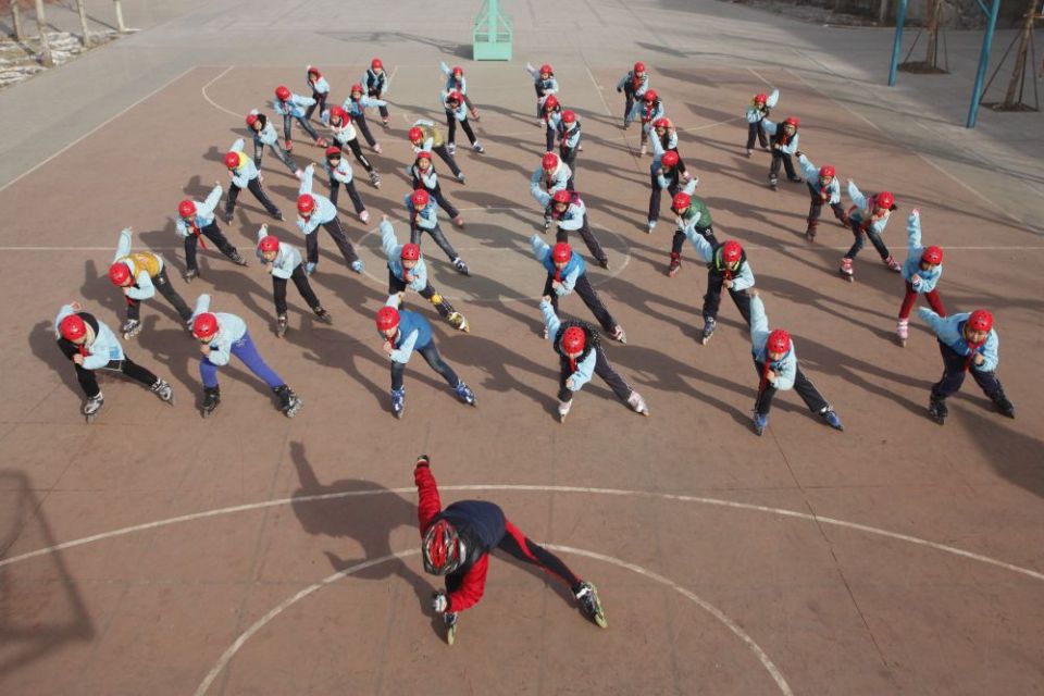 ↑2015年12月25日, 河北张家口经开区小学轮滑队员在教练带领下进行基础动作训练。新华社发(武殿森摄)