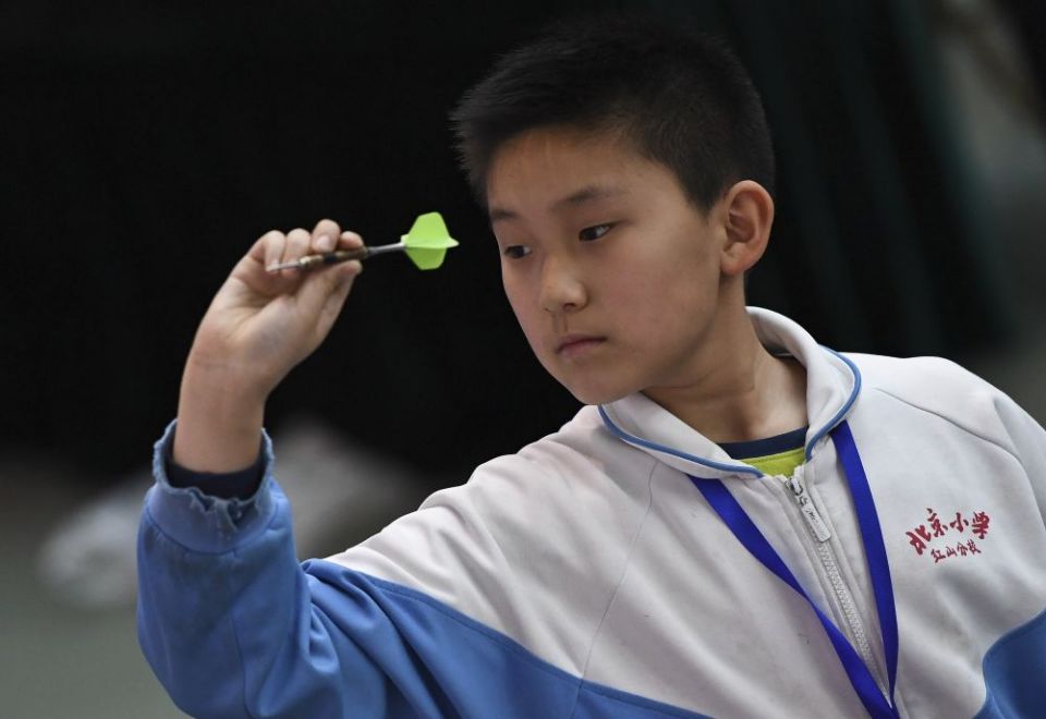 ↑2017年3月18日,来自北京小学红山分校的11岁小将黄培元在第六届“联创世纪”京都飞镖群英会青少年组预赛中。新华社记者夏一方摄
