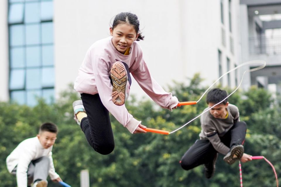 ↑2021年3月23日,在合肥市大通路小学新海校区,学生在大课间练习花样跳绳。新华社发(解琛 摄)