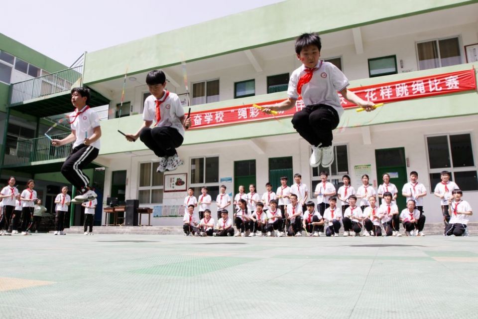 ↑2021年4月29日,河南省博爱县勤奋小学举行花样跳绳比赛。新华社发(程全 摄)