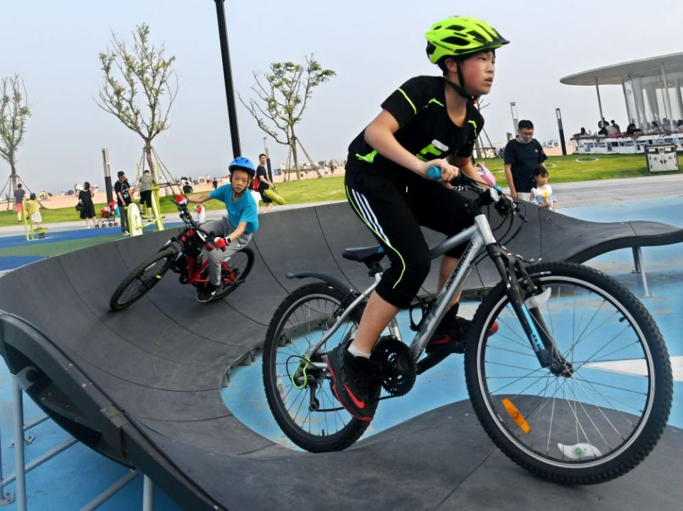 ↑2020年6月14日,两个男孩在青岛石老人海水浴场小轮车竞技场练习。新华社记者 李紫恒摄