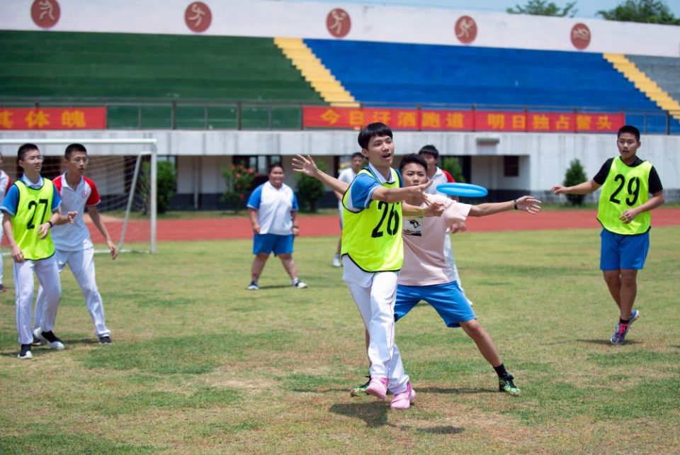 ↑2020年5月12日,北京师范大学海口附属学校的学生在体育课上练习极限飞盘。新华社记者 张丽芸摄