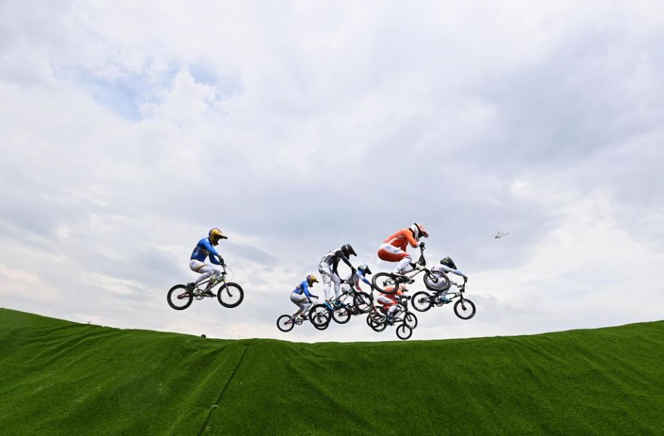 ↑2021年7月30日,参赛选手在东京奥运会男子小轮车竞速比赛中。新华社记者贺长山摄