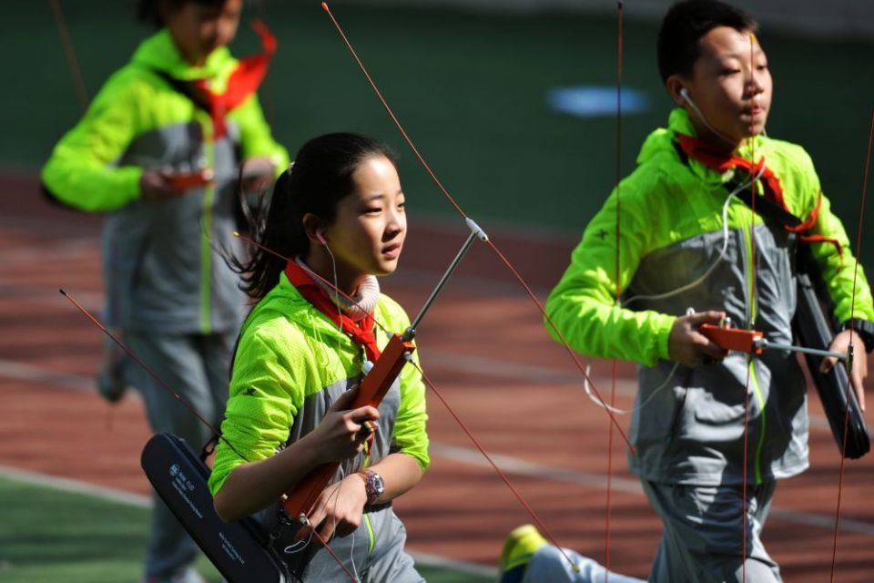 ↑2016年3月16日,兰州市通渭路小学学生在操场上进行无线电定向比赛。新华社记者 陈斌 摄