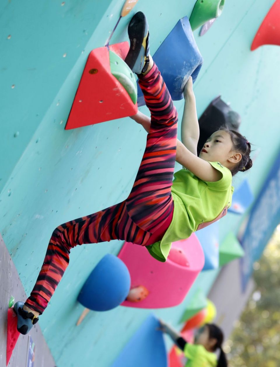 ↑2018年3月10日,广西梧州选手汤茹茜在2017-2018全国青少年U系列攀岩联赛东莞站U9女子攀石赛预赛中。新华社记者黄国保摄