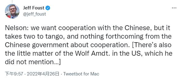 “纳尔逊说,我们希望与中国合作,但跳探戈需要两人,而且没有任何中国政府关于(愿意)合作的信息。(还有一个美国的“沃尔夫条款”的小问题,他没有提到……)”