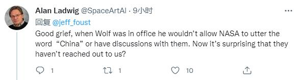 “天哪,当沃尔夫(‘沃尔夫条款’的起草和推动者弗兰克·沃尔夫)在任时,他不允许NASA说出‘中国’这个词,或与他们讨论。现在他们(中国)竟然没有联系我们,真是令人惊讶?”