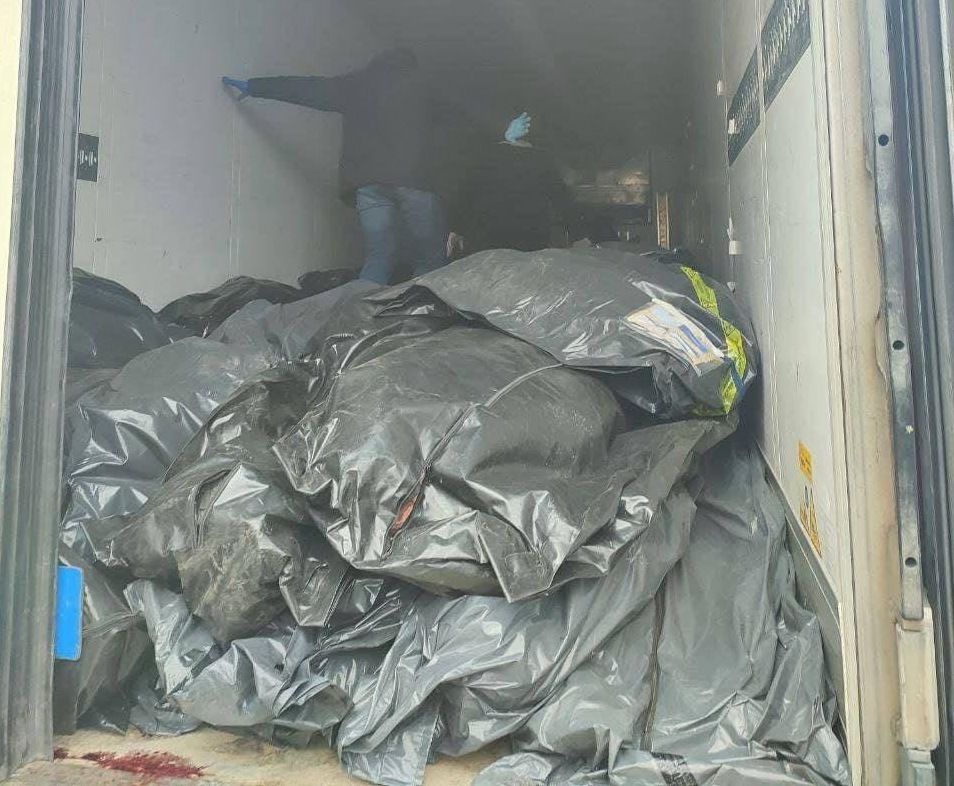 尸体被堆放在停尸房前的冷藏车中。图自社交网络