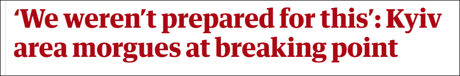 《卫报》称,基辅郊区的太平间3月初时便已没有足够的空间来容纳死者,因为无处停放,尸体只能被堆放在停尸房前的冷藏车中。“我们没有为此做好准备”,一名验尸官说,“没有人会想到会走到这一步”。