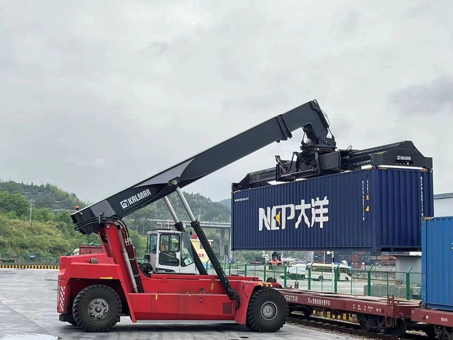 工作人员使用正面吊运机吊装集装箱到列车上。傅艺鹏摄