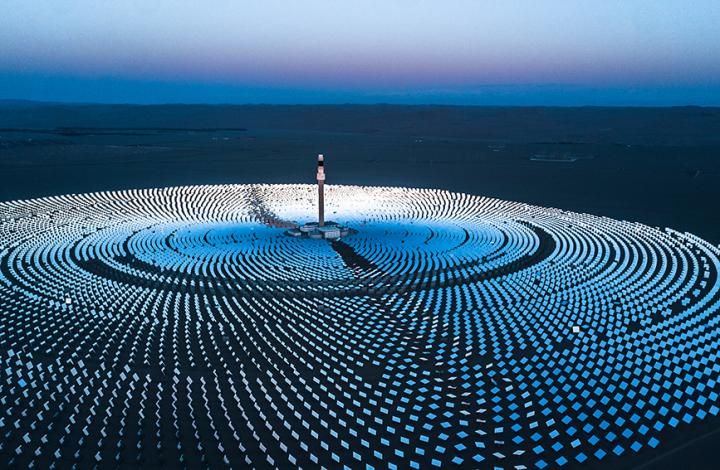 科创 甘肃敦煌:戈壁逐日 2022-05-03 09:16:59 分享 甘肃省敦煌市光电产业园区是甘肃省集中连片面积最大的光电产业园区,也是国家批准的“首个百万千瓦级太阳能光伏发电示范基地”。电站内1.2万余面 定日镜 以同心圆状围绕着260米高的吸热塔,这些定日镜在茫茫戈壁上夜以继日“逐日”,让“光”变成“电”,输送至千家万户。王斌银摄(人民图片网)