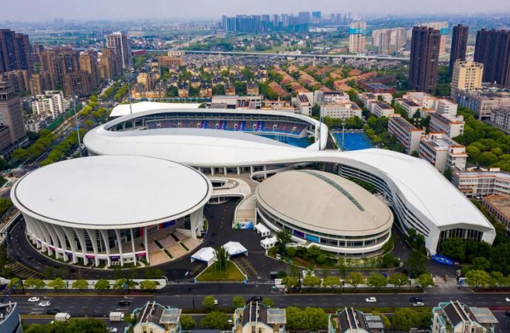 外观塑造上,临平体育中心采用了“丝绸之路”的设计理念,通过交互式的手法,以综合训练馆外形灵动的曲线为“丝路”起始,串联起杭州亚运会足球小组比赛场。同时,体育馆、体育场、训练馆和游泳馆中间建立了连廊平台,四个场馆连成一体,为现场观众进出场馆提供便利。
