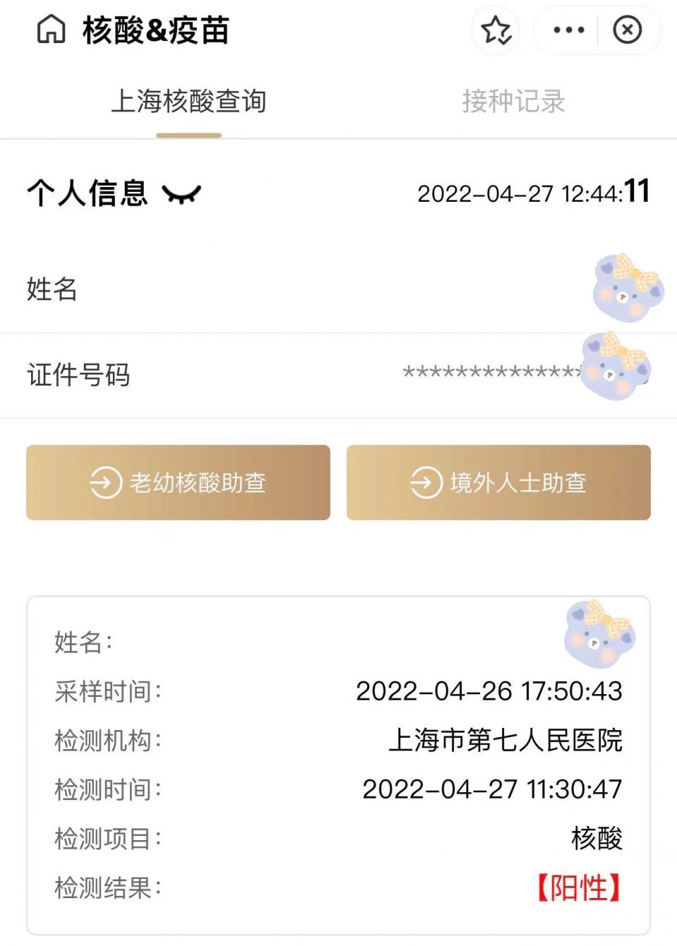 4月27日,母亲出舱后的首次核酸结果出来了,确实是“阳”性。看到结果后,她沉默了很久。我们也不知所措,都是第一次面对如此狡猾的病毒,谁也不知道“复阳”后会怎样,会不会再次转运。