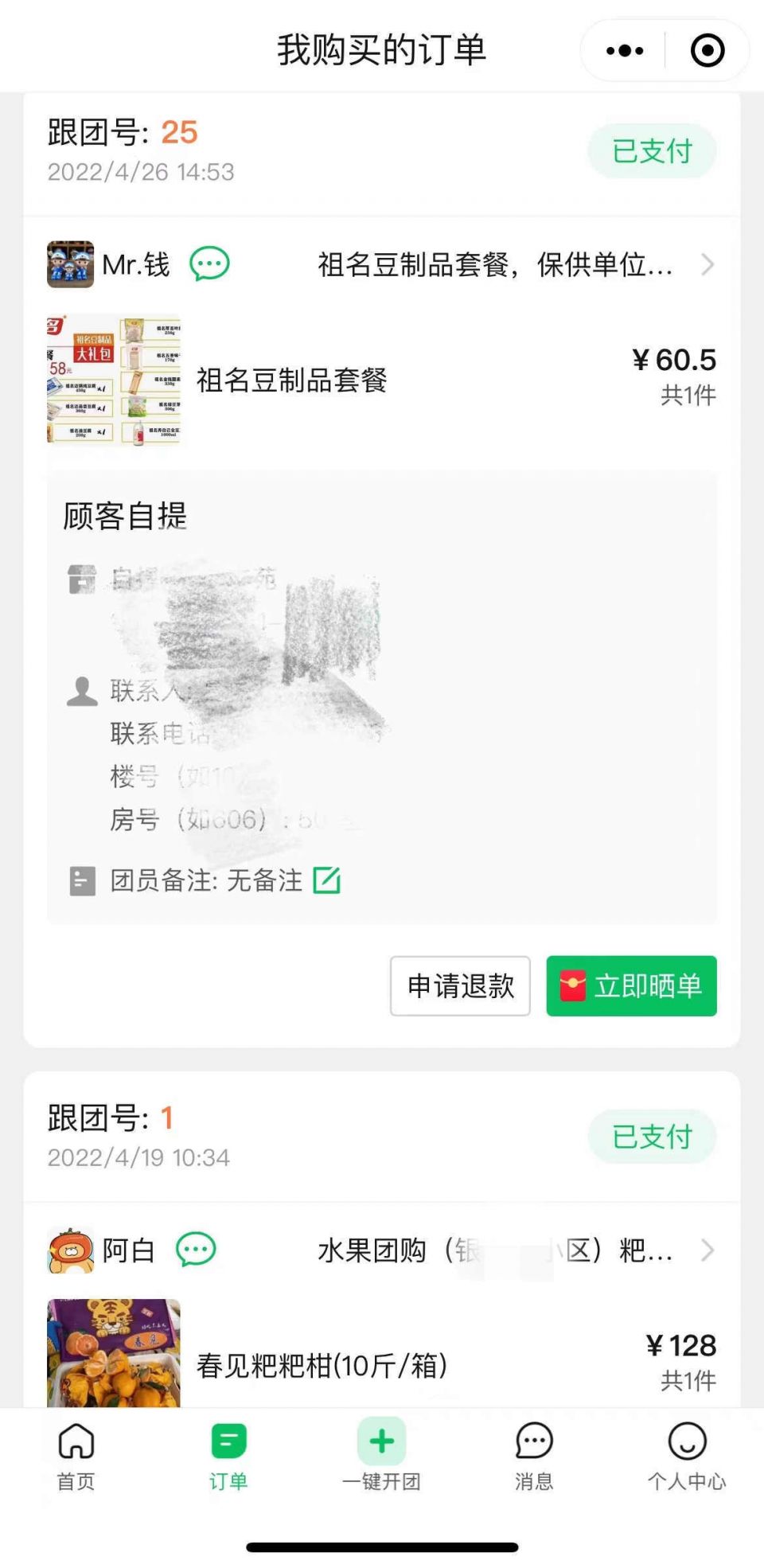 随着物资的逐渐消耗,我也开始跟团、接龙,相继购买了苹果、鸡蛋、猪肉、豆制品、耙耙柑、蔬菜包甚至小蛋糕,并随时关注团长们的动态。这期间,我们一家依然足不出户,严格执行7天健康监测管理。
