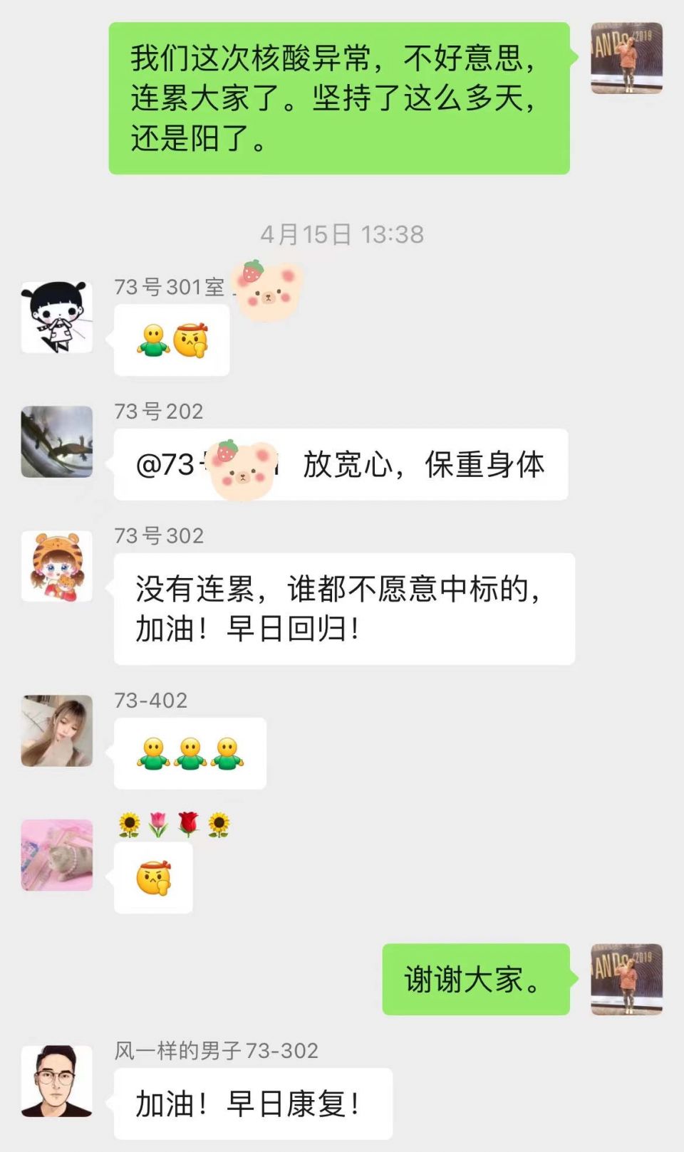 301室迅速跟了一个加油的表情。202室说,放宽心,保重身体。302室说,没有连累,谁都不愿意中招,加油,早日回归!201室说,别想那么多,加油,早日康复……