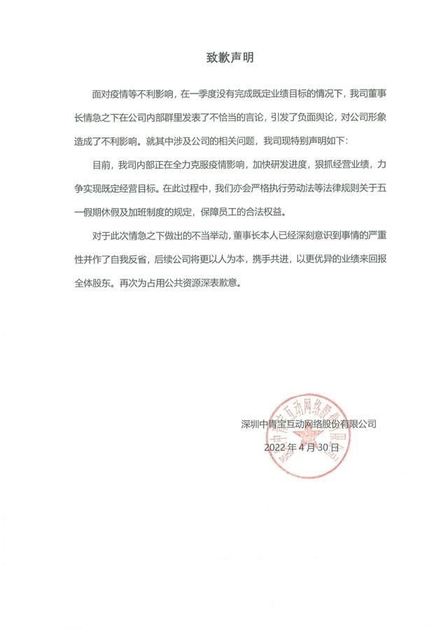 5月1日,中青宝微信号对此发布致歉声明,称会严格执行劳动法等法律规则关于五一假期休假及加班制度的规定,保障员工的合法权益。