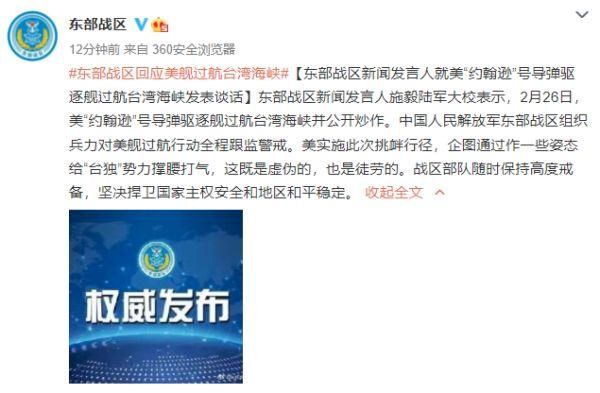 首页 美舰过航台湾海峡,东部战区回应! 2022-05-11 09:00:42 分享 本文转自:科技日报东部战区新闻发言人就美“约翰逊”号导弹驱逐舰过航台湾海峡发表谈话东部战区新闻发言人施毅陆军大校表示,2月26日,美“约翰逊”号导弹驱逐舰过航台湾海峡并公开炒作。中国人民解放军东部战区组织兵力对美舰过航行动全程跟监警戒。美实施此次挑衅行径,企图通过作一些姿态给“台独”势力撑腰打气,这既是虚伪的,也是徒劳的。战区部队随时保持高度戒备,坚决捍卫国家主权安全和地区和平稳定。来源:@东部战区编辑:王宇审核:岳靓终审:王郁