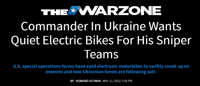 投入俄乌冲突的各种武器,杂乱得令人眼花缭乱:既有最先进的高超音速导弹,也有老掉牙的二战火炮。而美国“动力”网站11日还披露了乌克兰狙击手的最新装备——电动自行车。没错,就是中国人熟悉的“电驴”。