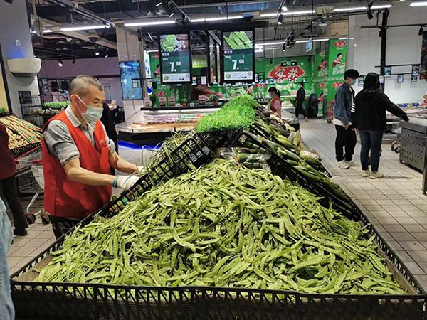 货台的果蔬从断货到补齐需要多久?“米面油肉蛋奶果菜等,我们不可能出现断供的情况,因为平时就会有完备的应急预案保障,在没断货前,新货已经备着了。” 李艳梅介绍,在客流的引导方面,一旦客流超出平均数量,就会启动限流措施,每小时进店人数控制在一百到两百人左右,并且会根据实际情况进行动态调整,“我 们店日均客流3000人左右,昨天超过了3600人,但是秩序平稳,店内广播循环告知货源充足不用抢购,同时要注意保持安全防疫距离。”李艳梅告诉记者, 她们店的所有管理人员都是应急保障小组成员,最近都是全员在岗状态,随时应对各种情况,最大程度保障顾客的正常生活需求。