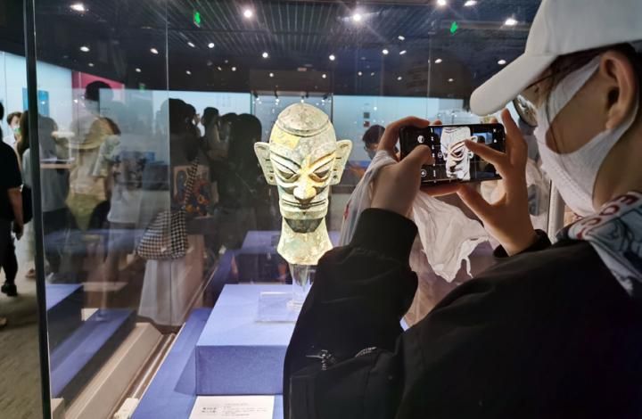 福建博物院展出的戴金面罩铜人头像。人民网刘卿摄