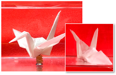 用纸制成的经典折纸鹤,上面涂有Choetsu(左)和无涂层(右)。当浸入水中时,涂层纸鹤保持其形状,而未涂层的纸鹤很快被水浸透并开始分解。图片来源:广井全二等人