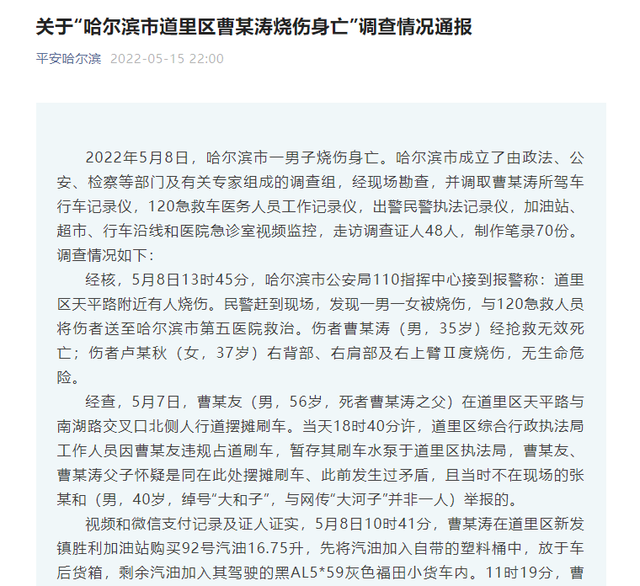 据“平安哈尔 滨”微信公众号消息,2022年5月8日,哈尔滨市一男子烧伤身亡。哈尔滨市成立了由政法、公安、检察等部门及有关专家组成的调查组,经现场勘查,并调取 曹某涛所驾车行车记录仪,120急救车医务人员工作记录仪,出警民警执法记录仪,加油站、超市、行车沿线和医院急诊室视频监控,走访调查证人48人,制作 笔录70份。调查情况如下: