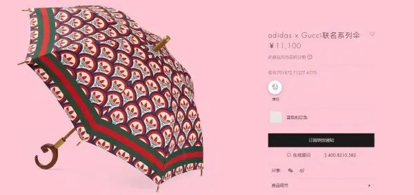 其中,一把印有Gucci和adidas花纹的联名系列伞,售价为11100元。商品详情一栏介绍:作为adidas x Gucci联名系列之一,这款伞饰有互扣式双G和Trefoil印花。Adidas和Gucci大胆探索联名系列,织带和GG字母交织图案巧妙搭配白色三条纹和三叶草徽标。